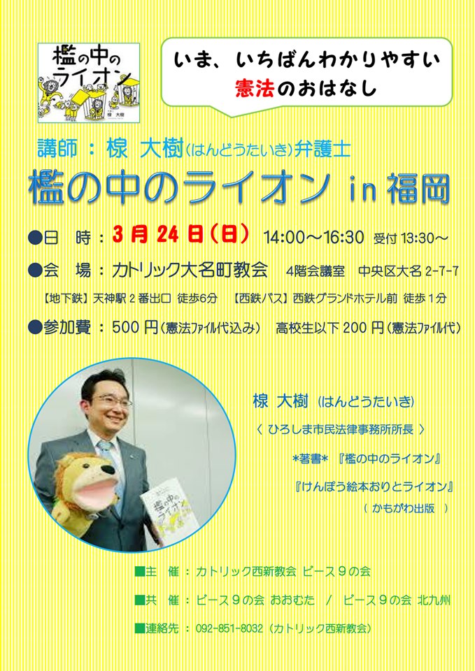 3月24日(日) 楾大樹弁護士の憲法カフェ「檻の中のライオン」in福岡・大名町教会☆